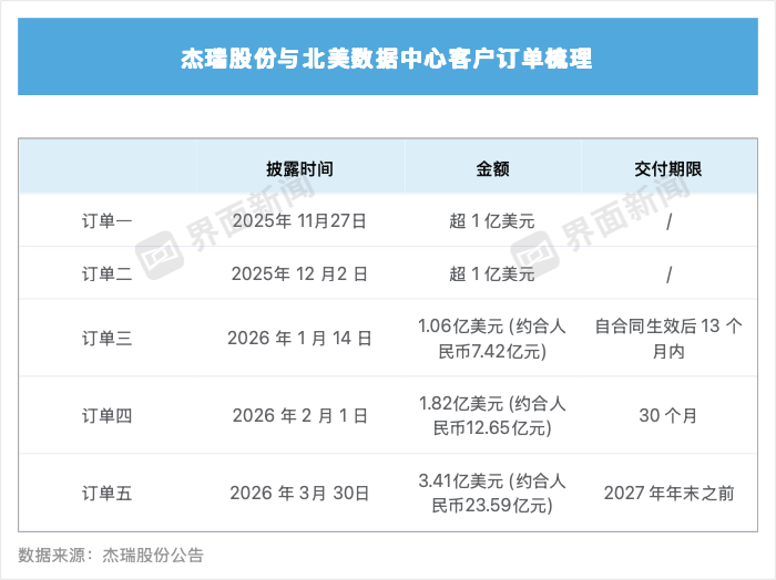 3月30日,界面新闻记者以投资者身份致电杰瑞股份证券部,相关工作人员称,数据中心用的发电机组销售业务自2025年11月才开始有订单。