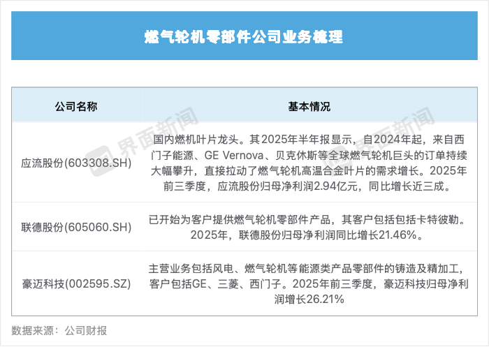 在上游核心零部件环节,应流股份(603308.SH)、联德股份(605060.SH)、豪迈科技(002595.SZ)等公司已陆续签署相关订单,提供燃气轮机零部件产品,业绩实现稳步增长。