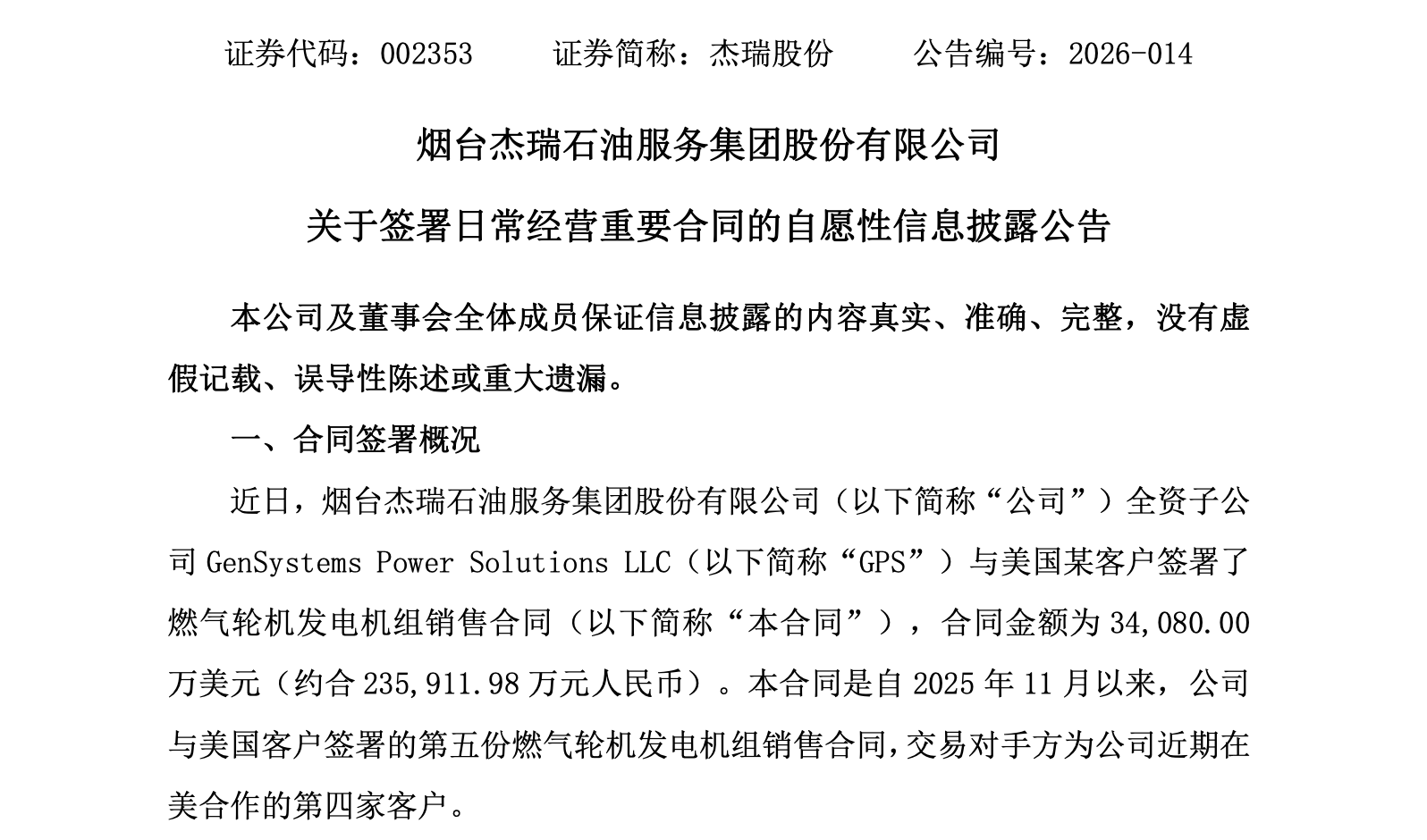 这是自2025年11月以来,杰瑞股份与美国客户签署的第五份燃气轮机发电机组销售合同。交易方为该公司近期在美合作的第四家客户。